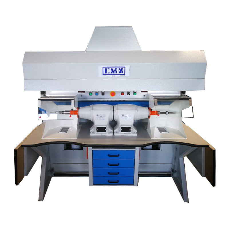 The 2-station self-cleaning aspirating workbench is designed for polishing metals (gold, silver, stainless steel, plated metals..etc.) and has a built-in filtering system to recover materials.